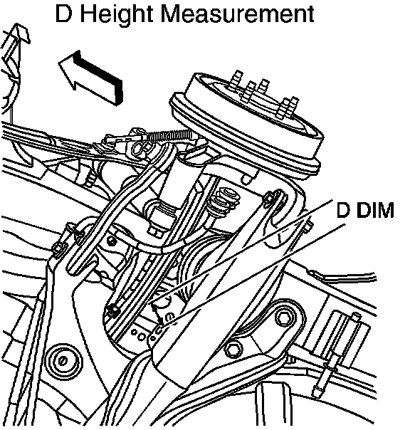 The D height dimension measurement determines the proper rear end ride height. There is no adjustment procedure. Repair may require replacement of suspension components.