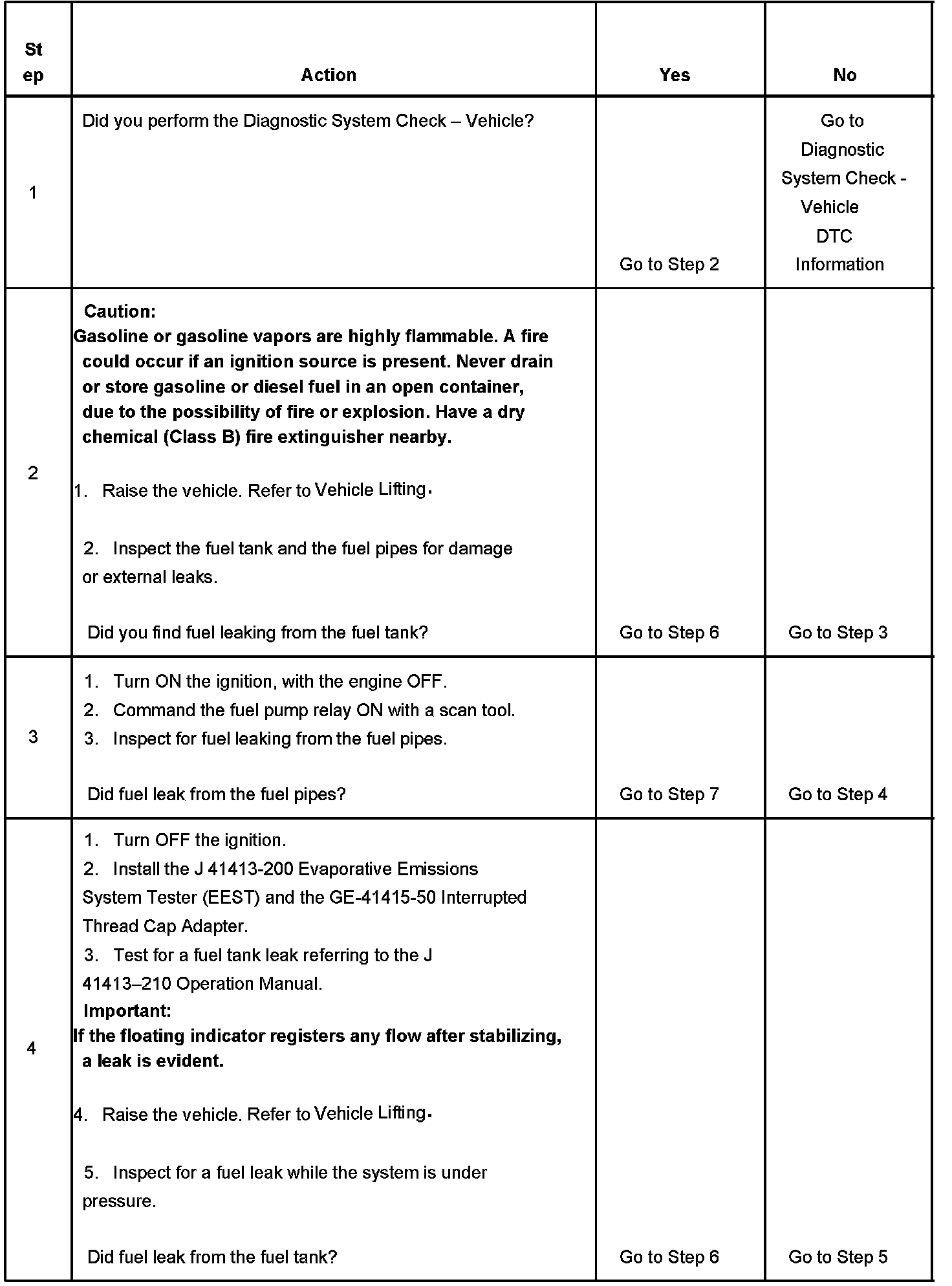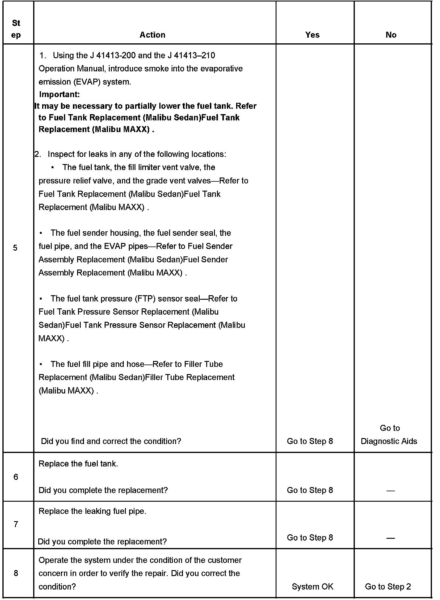 The fuel tank leak test is used to locate any fuel or fuel vapor escaping the fuel tank area. Fuel vapors escaping above the fuel level will be detected, if more than the calibrated amount, when the evaporative emission (EVAP) diagnostics complete one test cycle. The malfunction indicator lamp (MIL) will illuminate after the EVAP diagnostics have failed 2 test cycles.