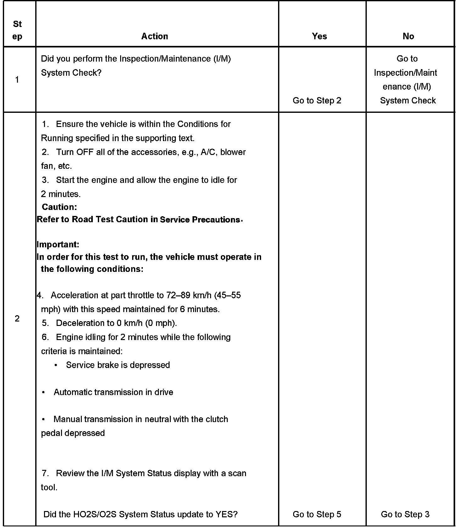 The purpose of this test is to satisfy the enable criteria necessary to execute I/M readiness diagnostics for the oxygen sensor/heated oxygen sensor (O2S/HO2S) system. The test may be used to set the I/M System Status to YES. The I/M System Status Display on the scan tool provides an indication of whether the control module has completed the required tests. The I/M System Status does not indicate that the tests have passed or failed. When all of the diagnostics for a specific system have run and passed the I/M System Status will update to YES. If a test for a specific system has failed, the I/M System Status will update to YES, indicating a determination was made, even if all of the other tests for that system have not run.