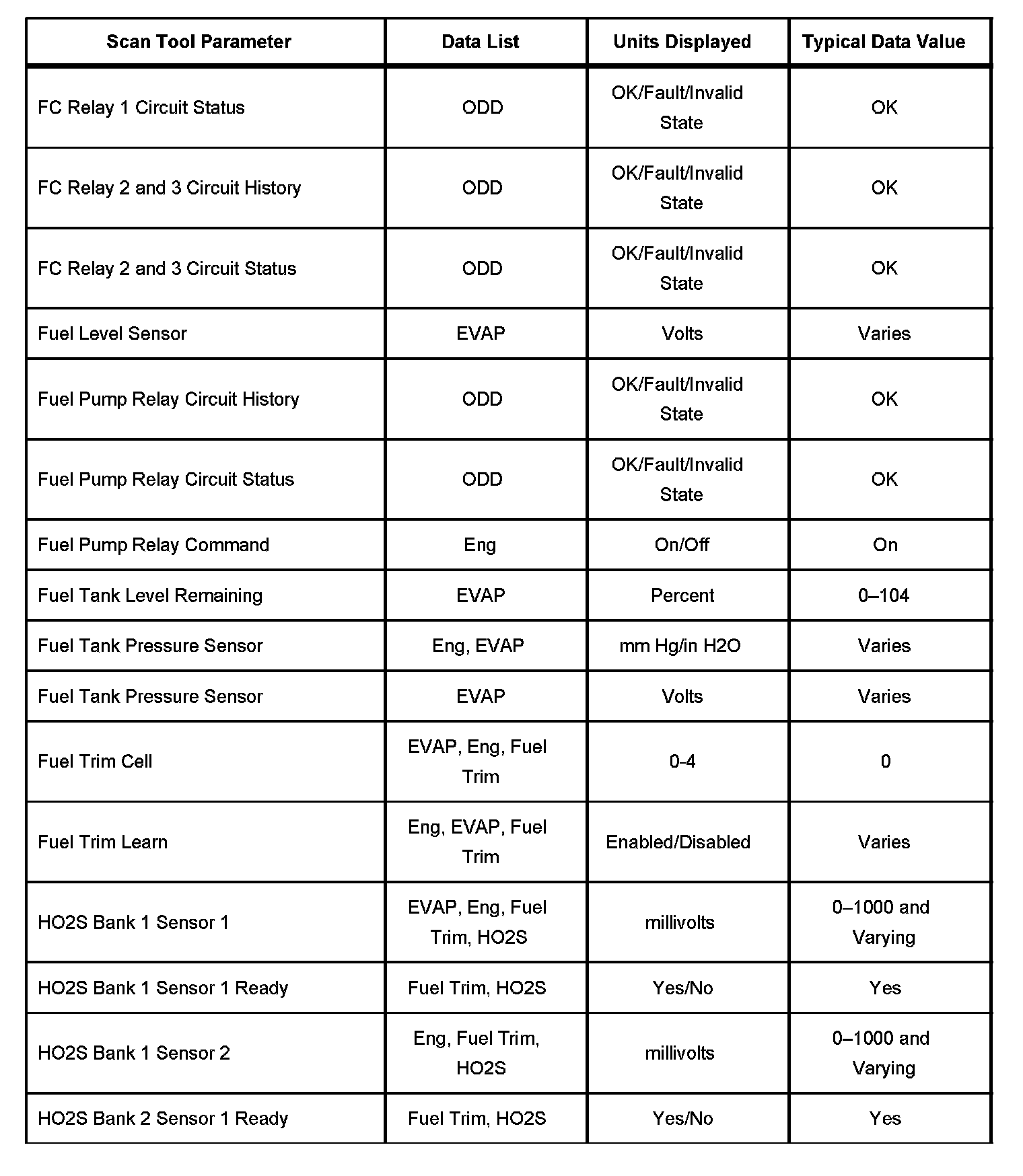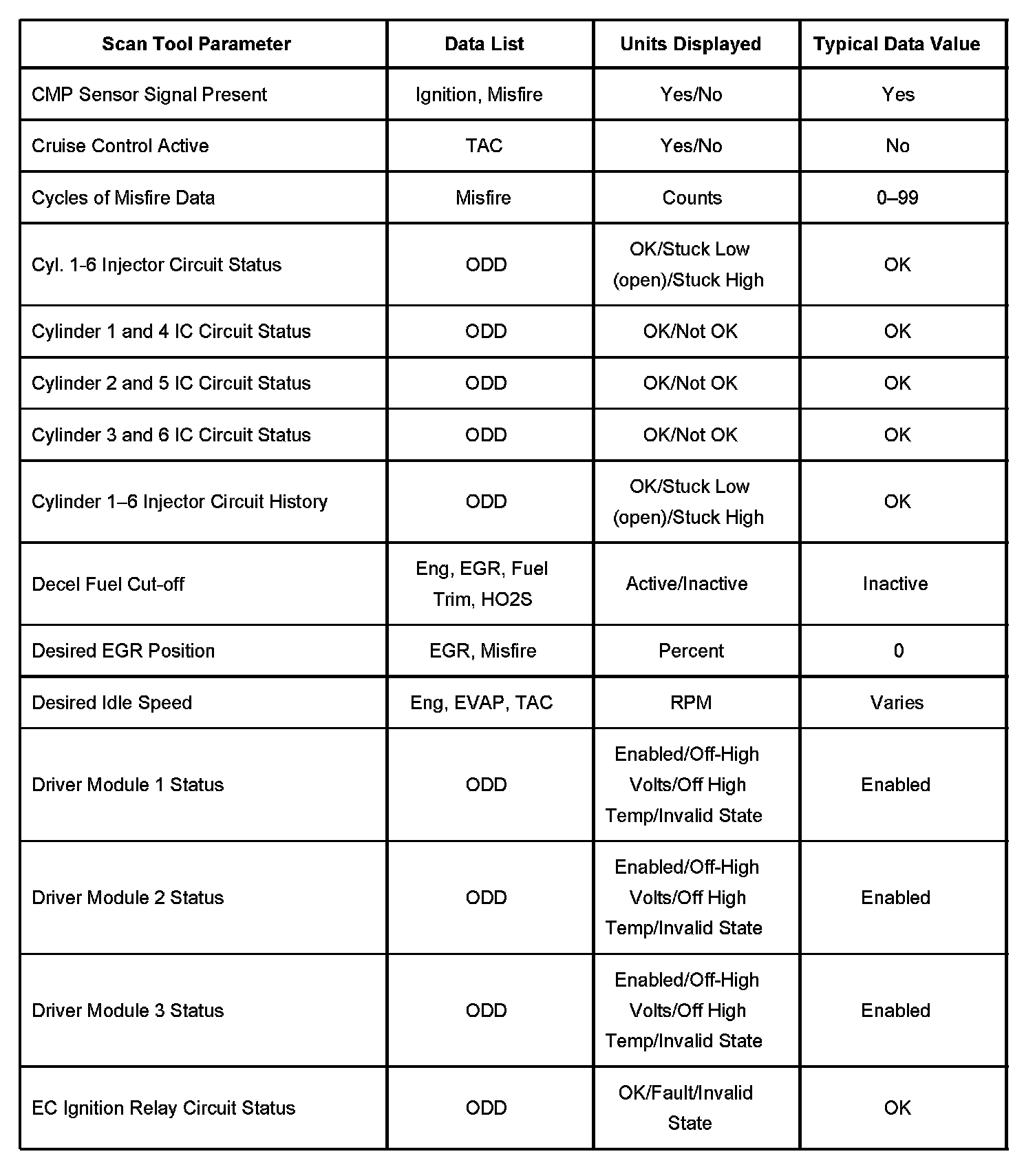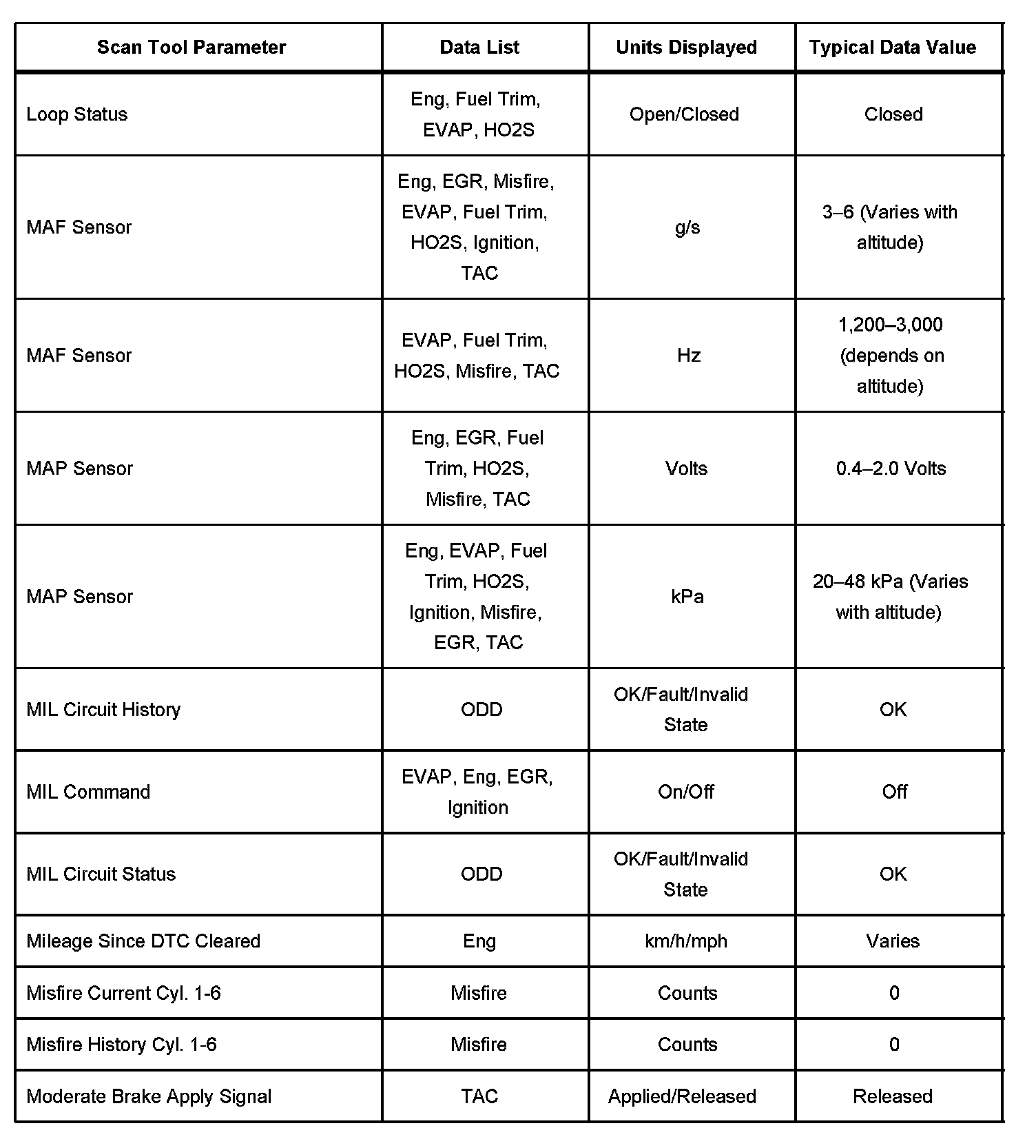 SCAN TOOL DATA LISTThe Engine Scan Tool Data List contains all engine-related parameters that are available on the scan tool. The list is arranged in alphabetical order. A given parameter may appear in any one of the data lists, and in some cases may appear more than once, or in more than one data list in order to group certain related parameters together.