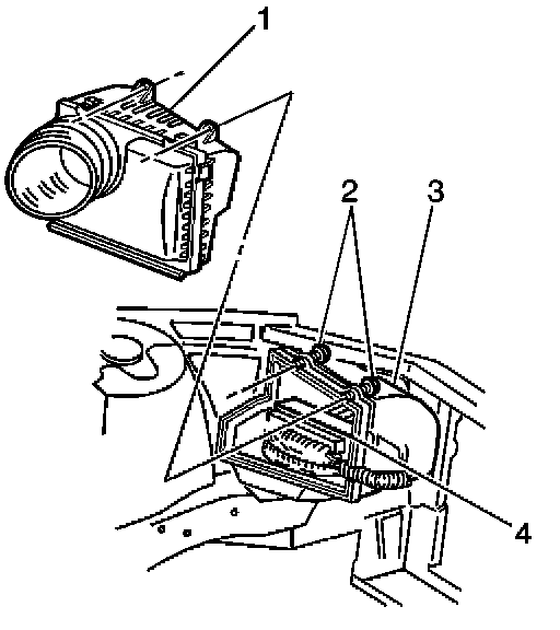 2. Install the PCM (4) and the harness into the air cleaner housing.