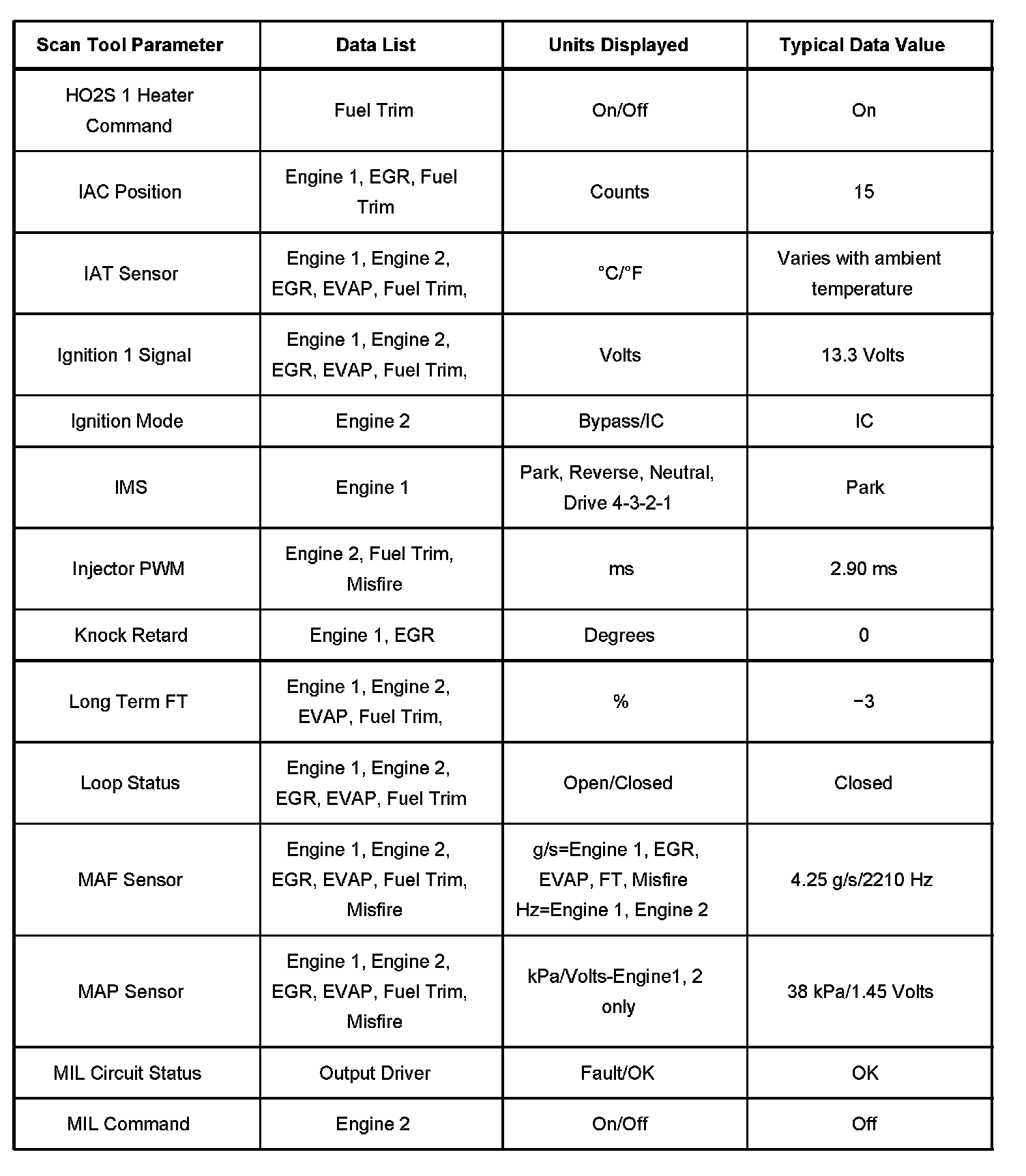 - Engine Data 1-Contains general information regarding fuel delivery, idle air control (IAC) position, heated oxygen sensor (HO2S) 1, HO2S 2, and other basic engine operating conditions.