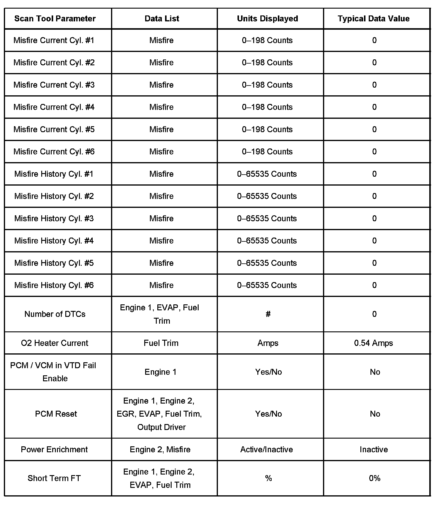 Use the Typical Scan Data Values table only after the Diagnostic System Check-Computers and Control Systems has been completed, no DTCs were noted and you have determined the on-board diagnostics are functioning properly. Scan tool values from a properly running engine may be used for comparison with the engine you are diagnosing. The Typical Scan Data values represent values that would be seen on a normally running engine.