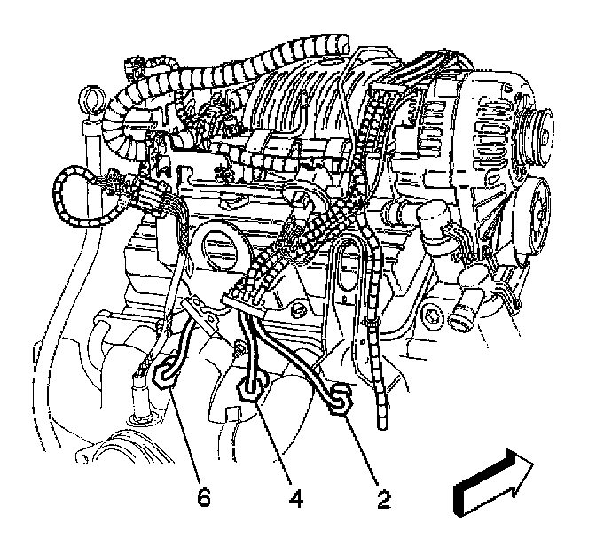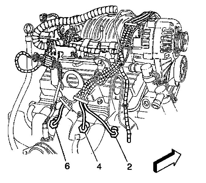 5. Install the spark plug wires (2, 4, 6) to the spark plugs in the proper position at the rear of the engine.