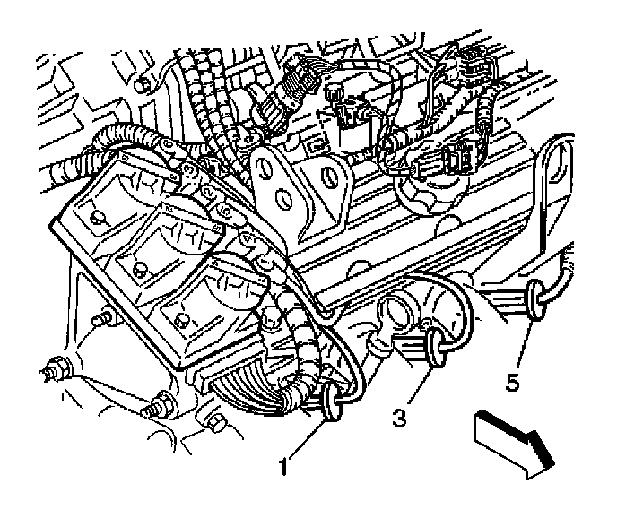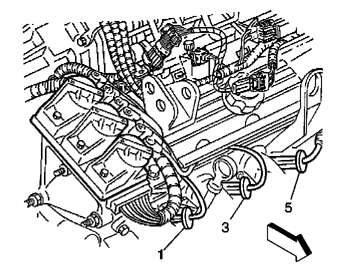 3. Remove the spark plug wires (1, 3, 5) from the spark plugs at the front of the engine using the following steps: