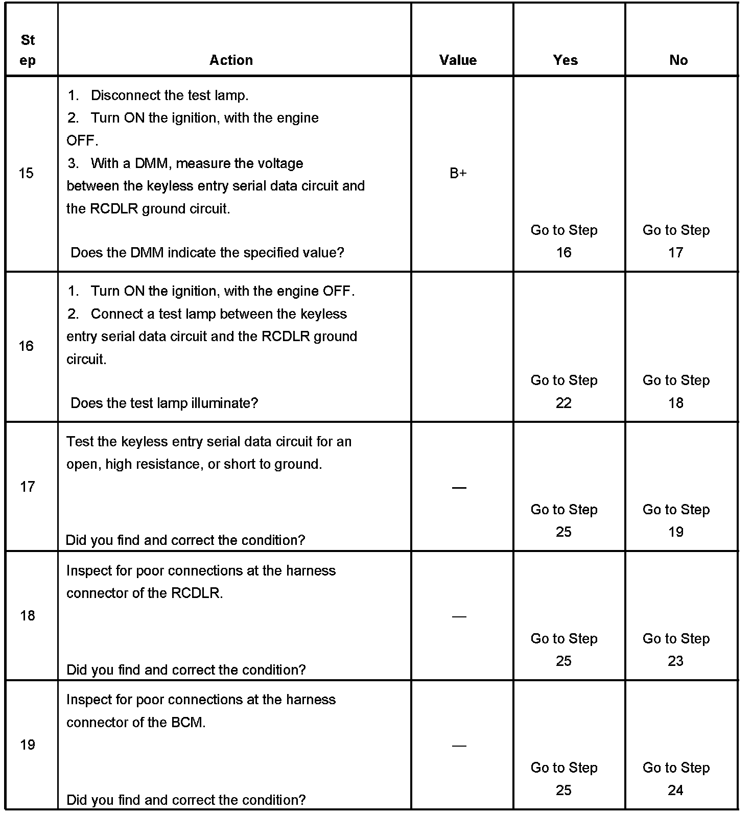 16. An illuminated test lamp at step 16 reveals a short to voltage in the serial data circuit.