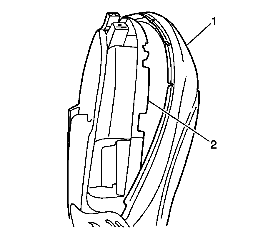 5. Remove the seat back cover retaining tabs (2) along each side of the seat back panel (1).