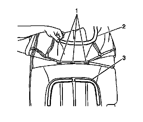 9. Install the seat back cover retaining tabs (3) along the bottom of the seat back panel.