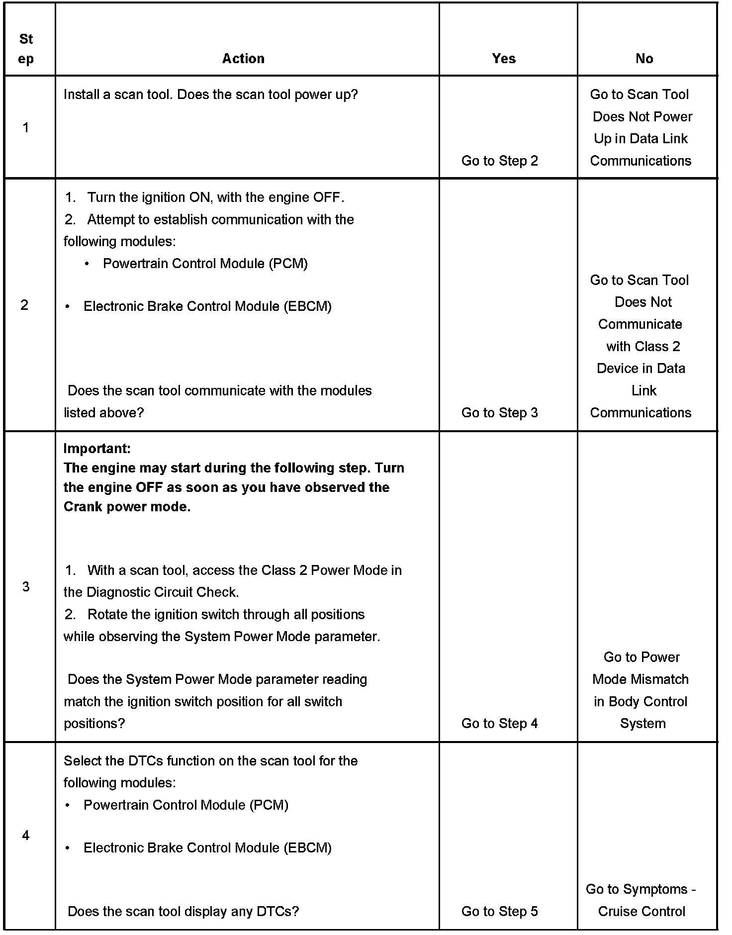 The Cruise Control Diagnostic System Check is an organized approach to identifying a condition created by an electronic control system failure. The Diagnostic System Check directs the service technician to the next logical step in diagnosing the concern. Understanding the system, the table, and using it correctly reduces diagnostic time and prevents misdiagnosis. For a review of the cruise control system, refer to Cruise Control Description and Operation.