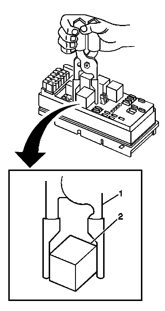 1. Using J 43244 (1) position the tool on opposing corners of the compressor relay (2).