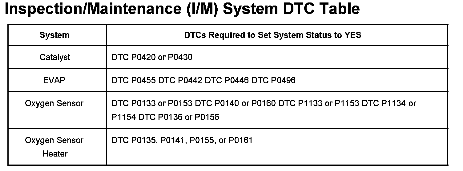 Inspection/Maitenance (I/M) System (DTC) Table