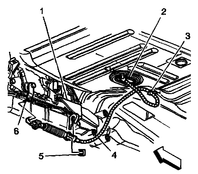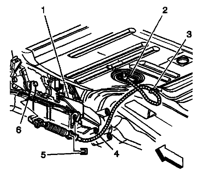 11. Remove the range selector cable end from the transmission range selector lever ball stud (6) and the bracket (1).