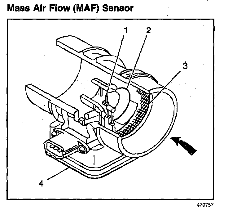 The mass air flow (MAF) sensor consists of a heat resistor element (1), a metering duct (2), an air straightening screen (3), a body and control circuit board (4).