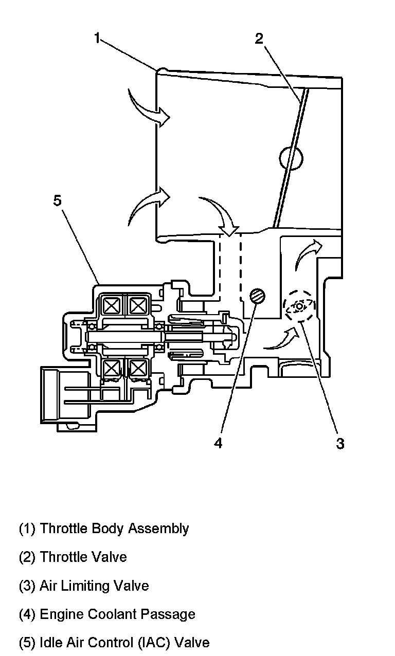 The throttle valve is interlocked with the accelerator pedal by the accelerator control cable. The throttle valve controls the large volume of air that is drawn into the intake chamber. The idle air bypass passage provides air for the control of engine speed when the throttle valve is closed. The air limiting valve provides additional bypass air to engine when the engine is cold. The air limiting valve is a bi-metal spring that is preset at the factory and cannot be adjusted. The air limiting valve is not serviced separate from the throttle body assembly. The throttle body is warmed by engine coolant that flows through the idle air control valve and into a coolant passage located in the throttle body. The warming of the throttle body helps prevent throttle valve icing. Attached to the throttle body are the Throttle Position (TP) sensor and the Idle Air Control (IAC) valve.