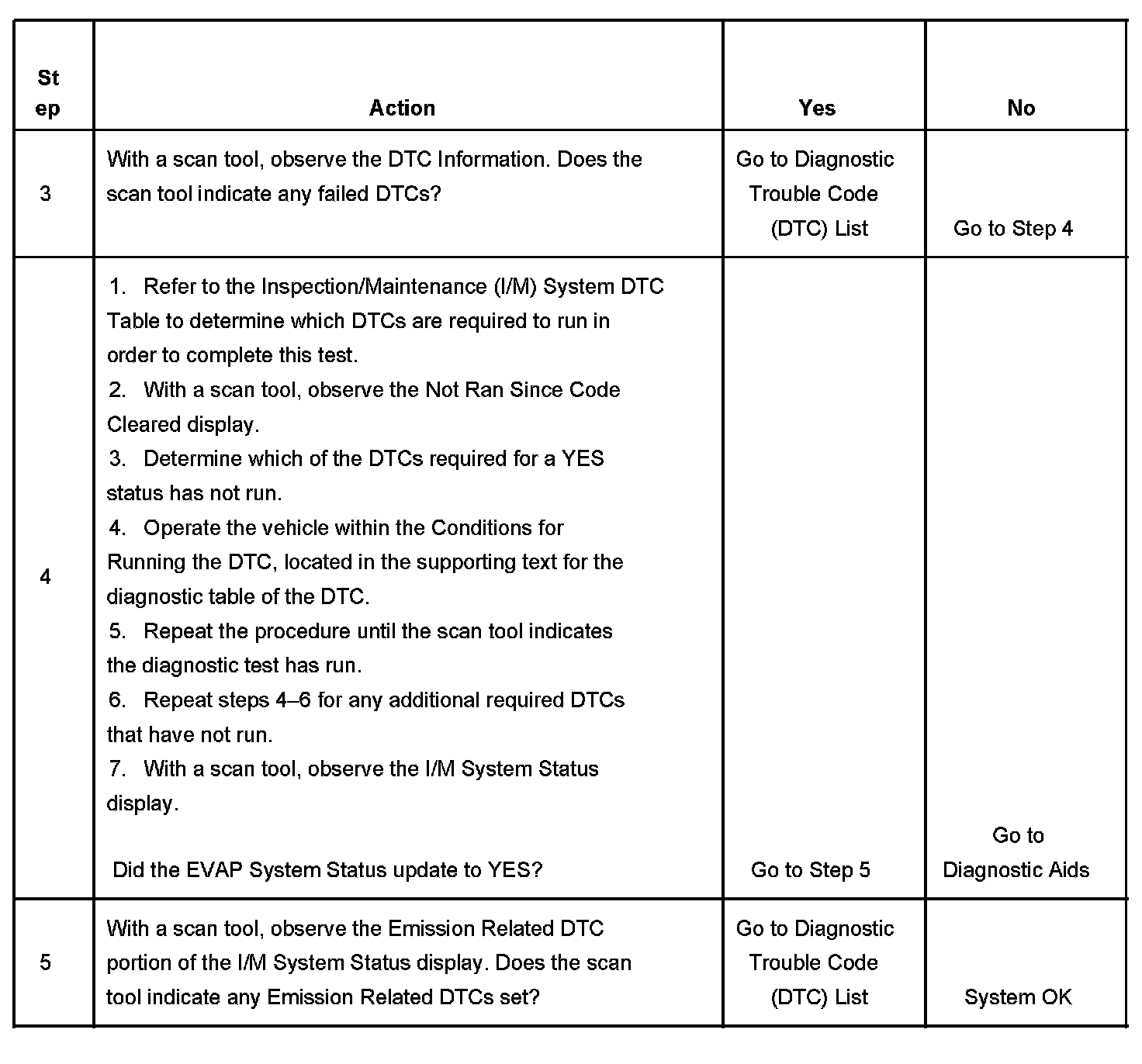 3. This step is to identify a first failure of a type B DTC. A DTC only appears on the I/M System Status display when it becomes a MIL illuminating DTC. This occurs on the second failure of a type B DTC. A first failure of a type B DTC will not allow the I/M System Status to update to YES. Refer to Diagnostic Aids.