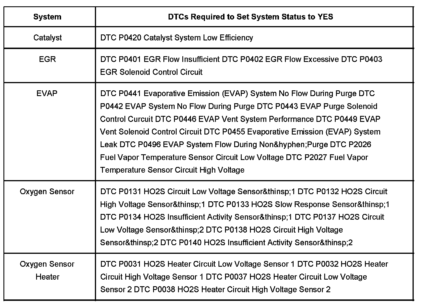Inspection/Maitenance (I/M) System (DTC) Table
