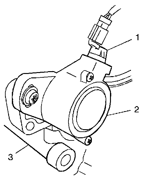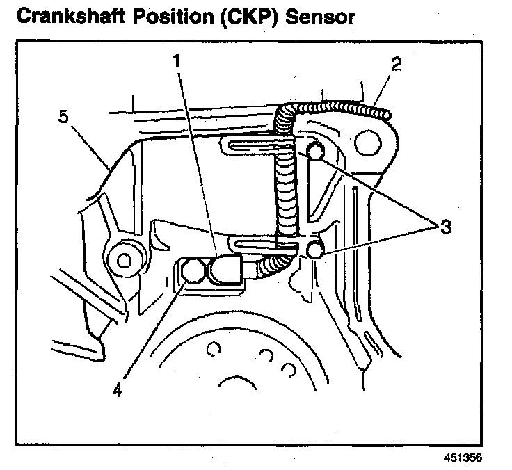 The crankshaft position sensor (1) is mounted in the engine block (2), behind the flywheel or flexplate. The PCM receives a digital signal from the CKP sensor. The PCM uses the CKP sensor signal in order to determine crankshaft speed. The PCM uses crankshaft speed as one of the inputs in engine misfire monitoring. The CKP sensor is not adjustable.