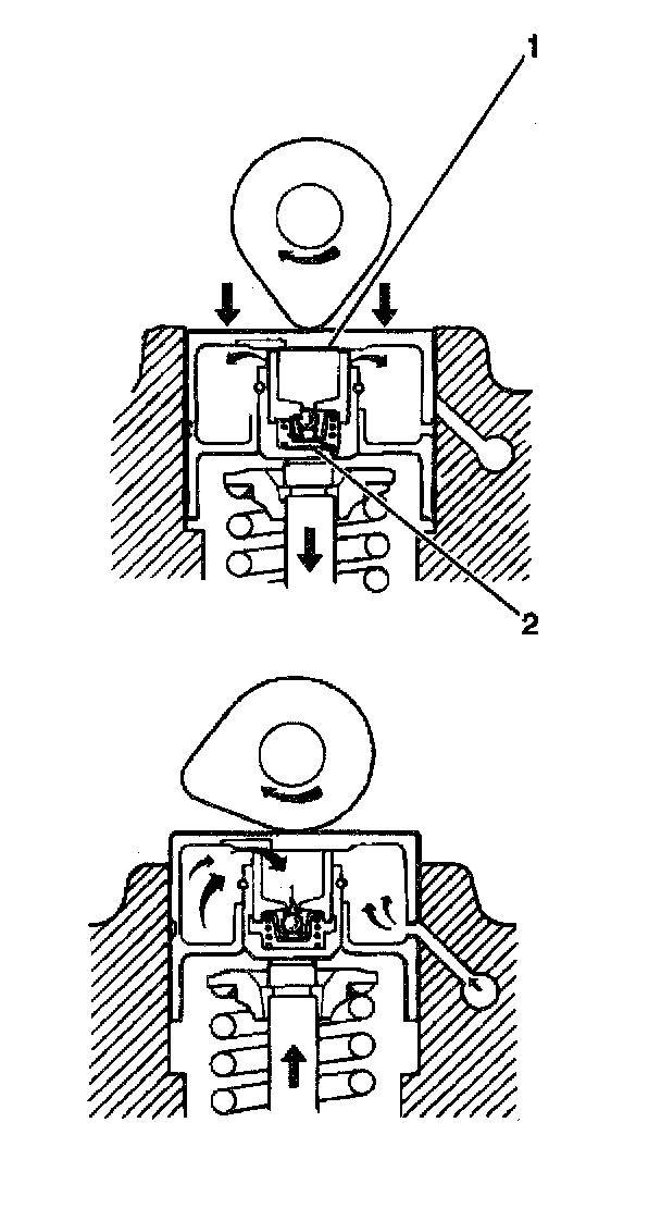 1. When the camshaft is not depressing the HVL adjuster, the adjuster is held against the camshaft and the valve stem by the plunger spring. In this state, the valve lash is kept at 0. At 0 valve lash, the oil pressure becomes equal in the A (1) and B (2) chambers, and the check ball closes the passage between these 2 chambers.