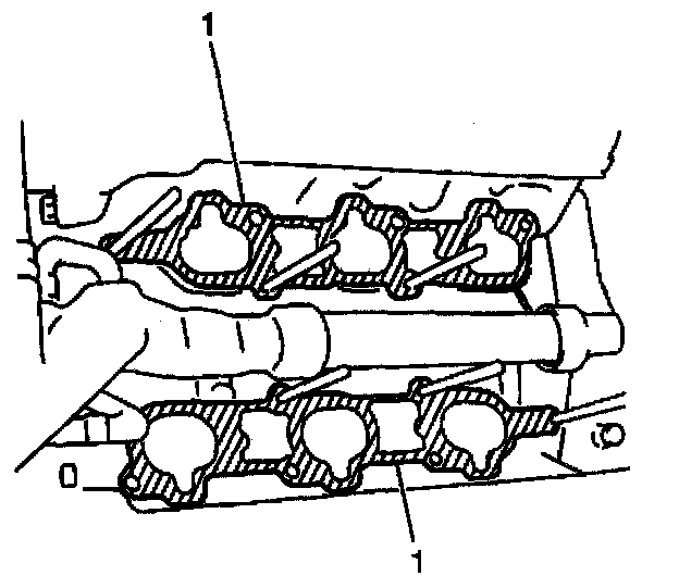 1. Install the new intake manifold gaskets (1) onto the cylinder heads.