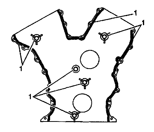 2. Apply GM P/N 12346240 or equivalent to the front cover at the points indicated (1).