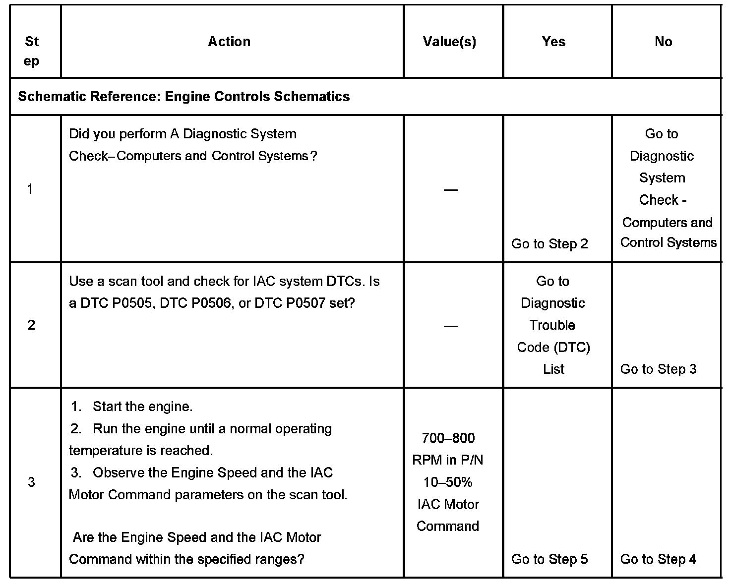 Any condition that can affect engine performance at idle, can affect the performance of the IAC system. A careful visual and/or physical inspection of the engine is necessary when the scan tool indicates that the engine speed or the IAC Motor Command readings are out of range.