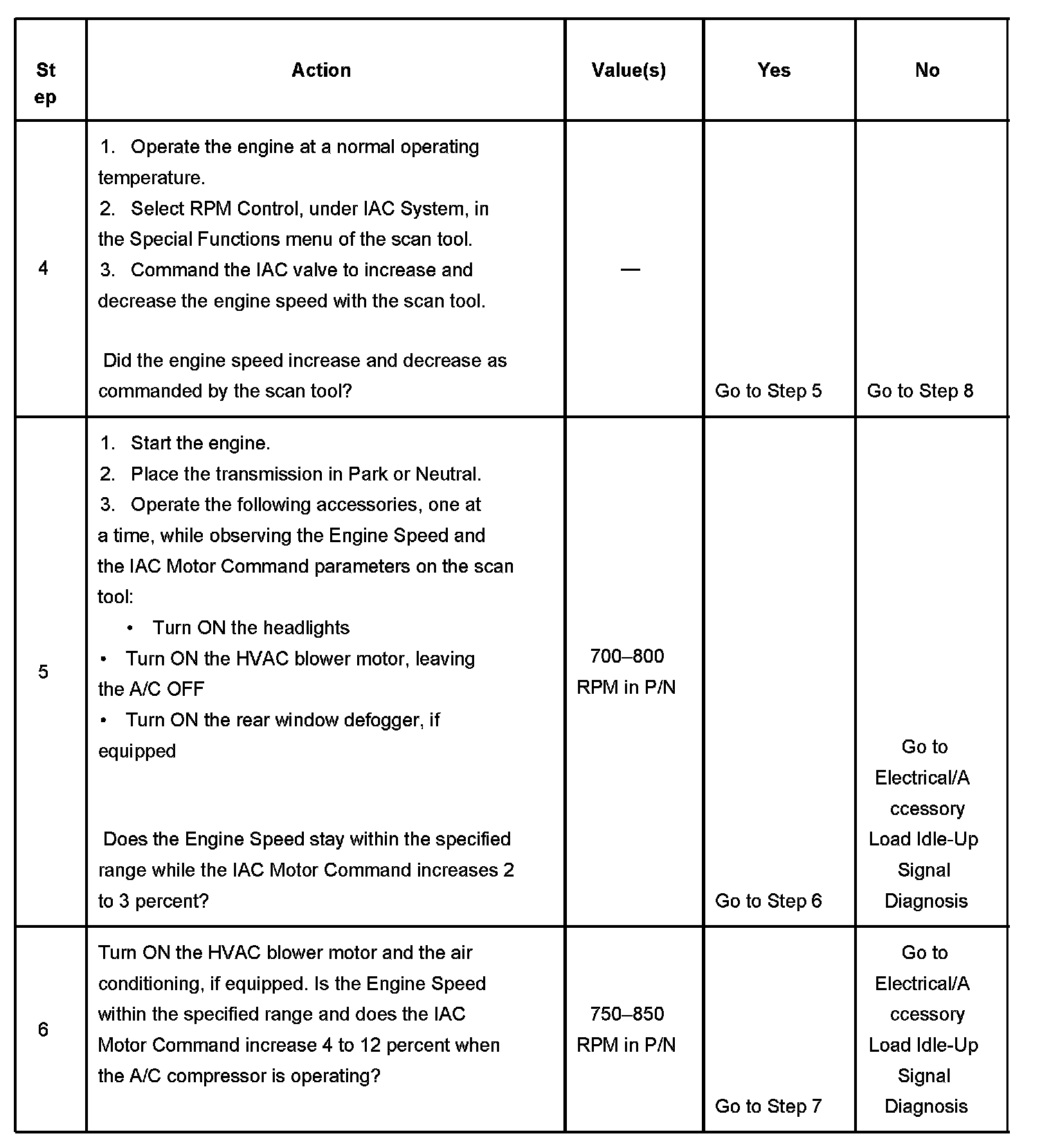 5. This step checks the operation of the electrical load idle-up circuits. If there is no increase in the IAC Duty Cycle percentage when the accessory is turned on, the idle-up circuit may be inoperative or always on.