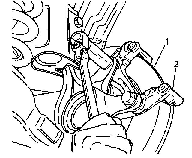 2. Remove the 2 mounting bolts and the caliper bracket (2) from the vehicle.