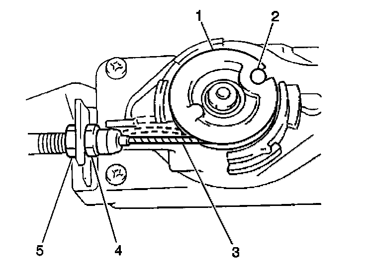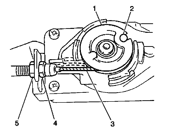 4. Adjust the cruise control servo cable locknuts (5) in order to adjust the cruise control servo cable play.