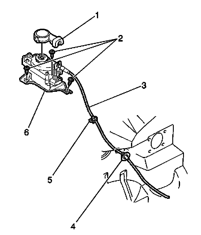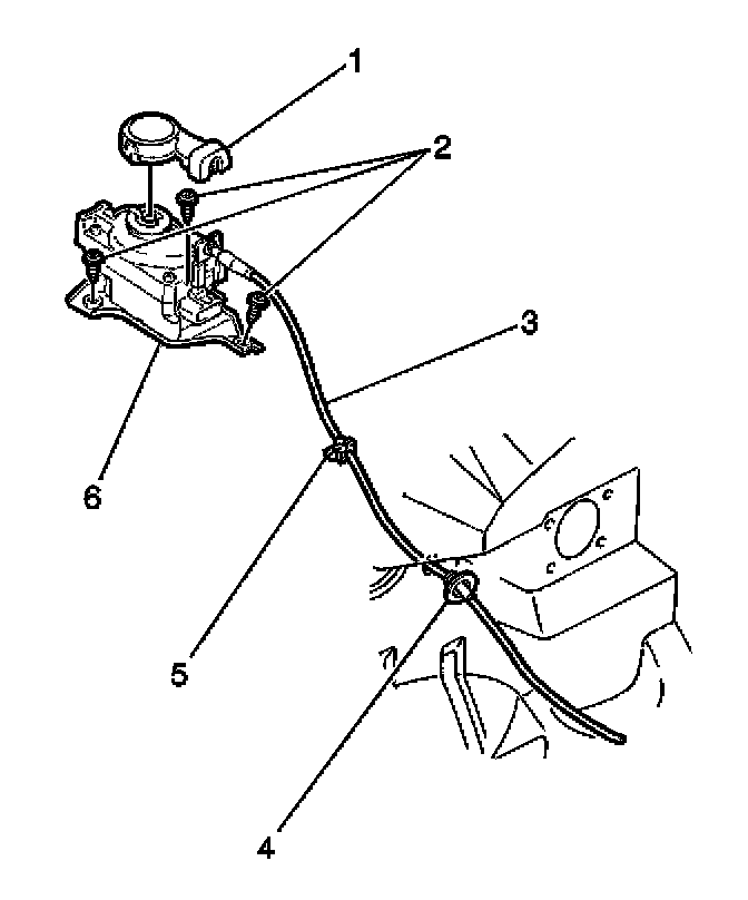 1. Install the cruise control servo assembly (6) to the vehicle. Secure the assembly with the 3 bolts (2).