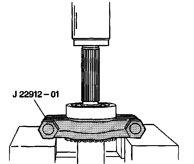 38. Use J22912-01 and a press arbor in order to remove the rear output shaft front bearing from the rear output shaft.