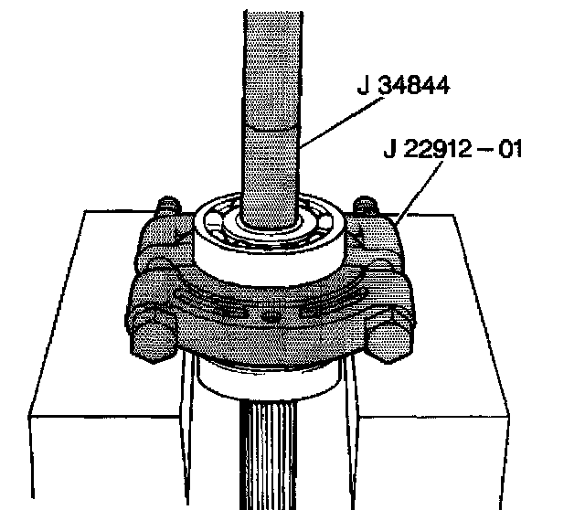 43. Use J 22912-01 with J 34844 and a press arbor in order to remove the front output shaft bearings from the front output shaft.