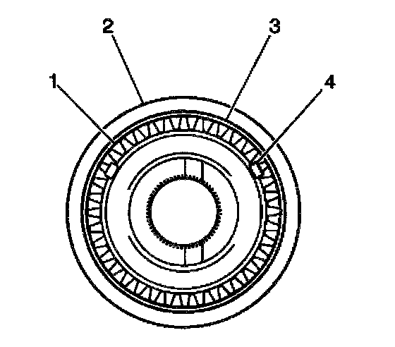 47. Using snap ring pliers, remove the side bearing snap ring (1) from the input gear.