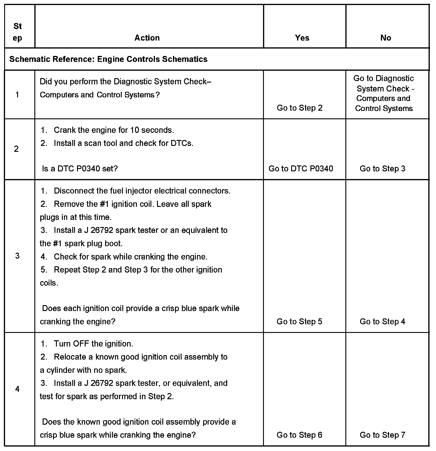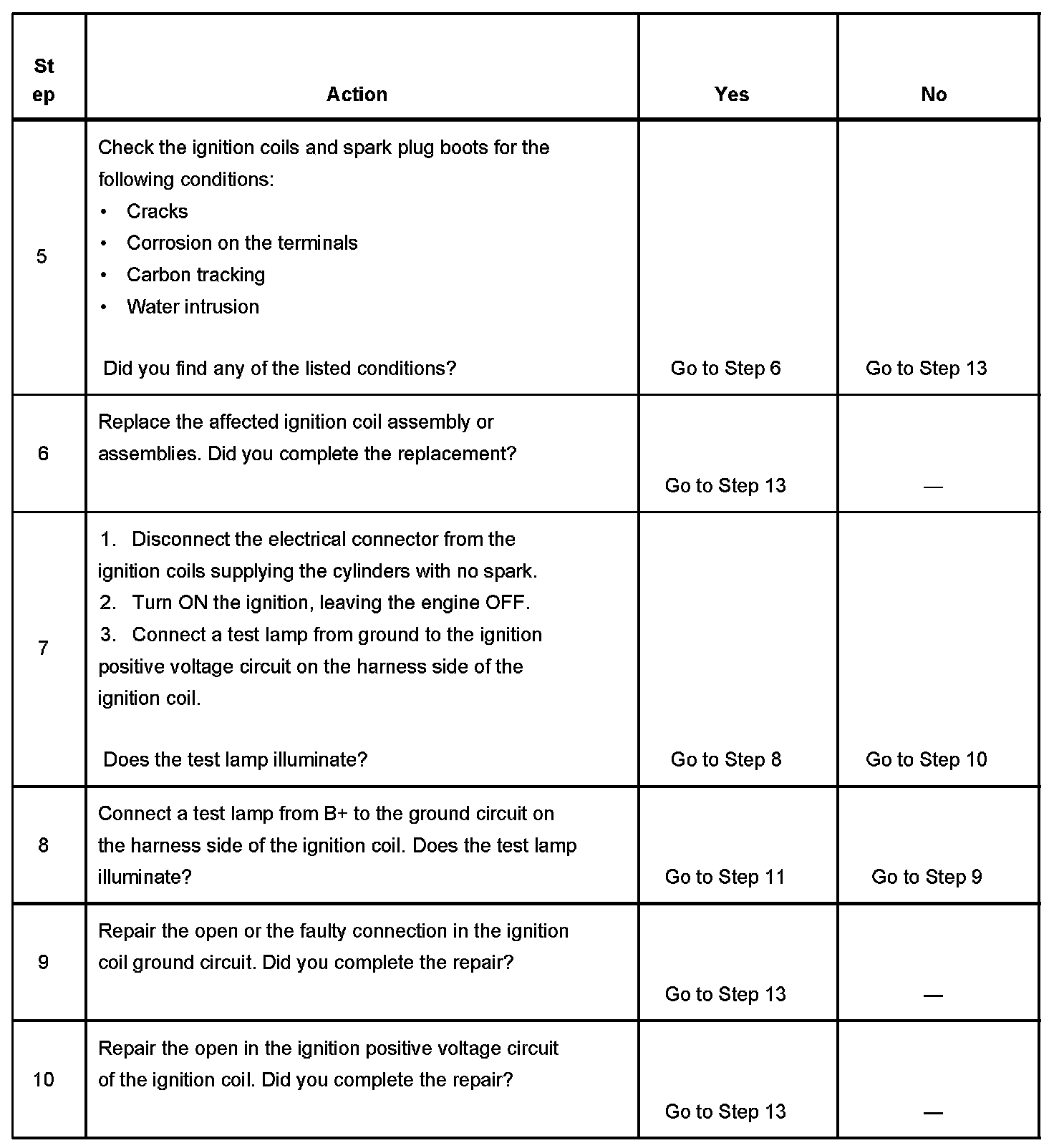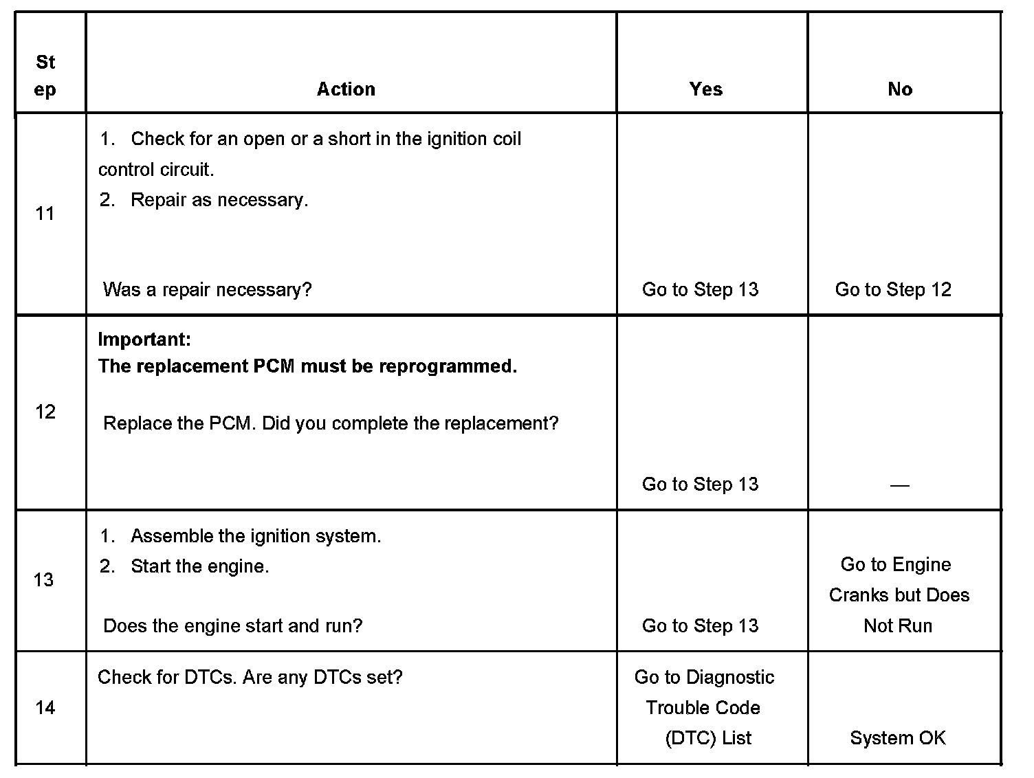 13. This step checks whether the engine will start and run. A repair that has been performed leading to this step may only have been a contributing cause of a no start condition. Returning to the Engine Cranks But Does Not Start diagnostic table will locate additional causes of the no start condition.