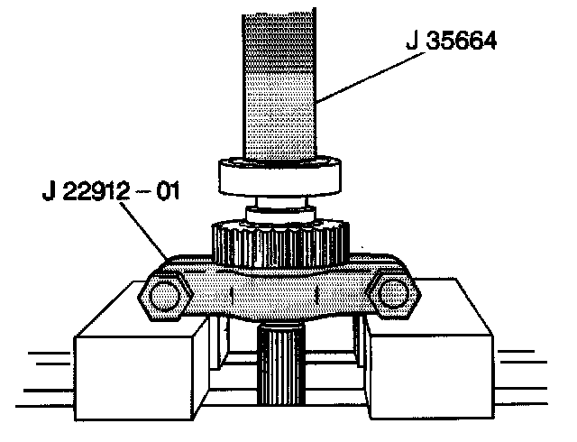 12. Use J 35664 with J 22912-01 and a press arbor in order to install the front output shaft bearings onto the front output shaft.