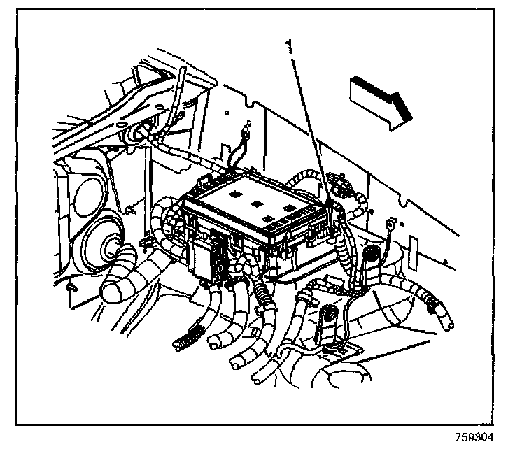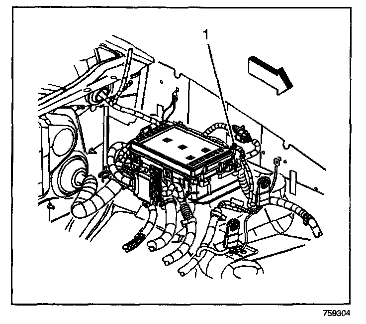 7. Connect the positive cable to the junction block and secure the positive cable with the bolt (1).