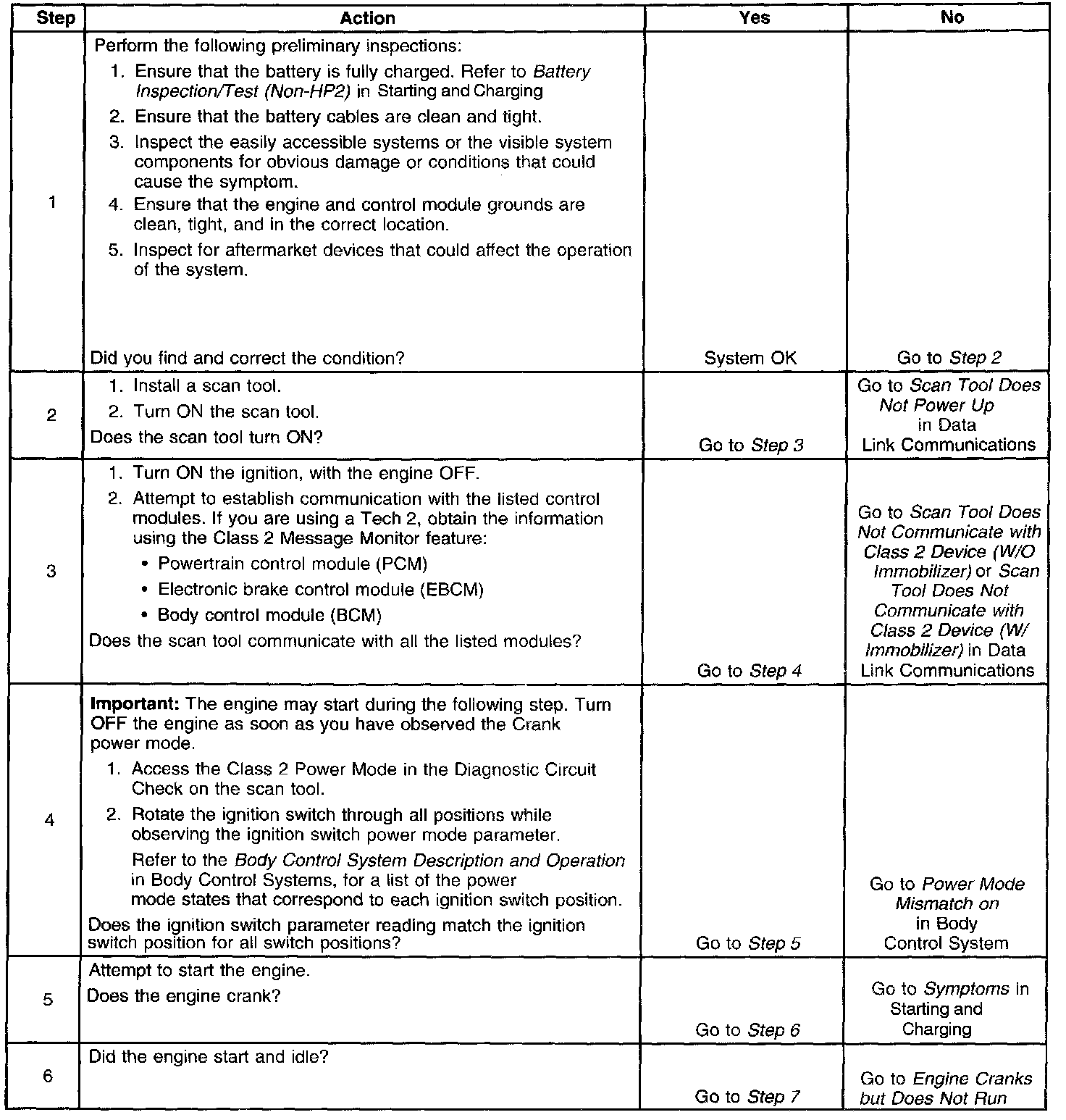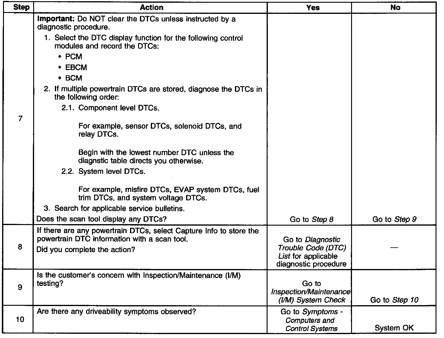 The Diagnostic System Check is an organized approach to identifying a condition that is created by an electronic engine control system malfunction. The Diagnostic System Check must be the starting point for any driveability concern. The Diagnostic System Check directs the service technician to the next logical step in diagnosing the concern. Understanding the table and correctly using the diagnostic table reduces diagnostic time, and prevents the replacement of good parts.