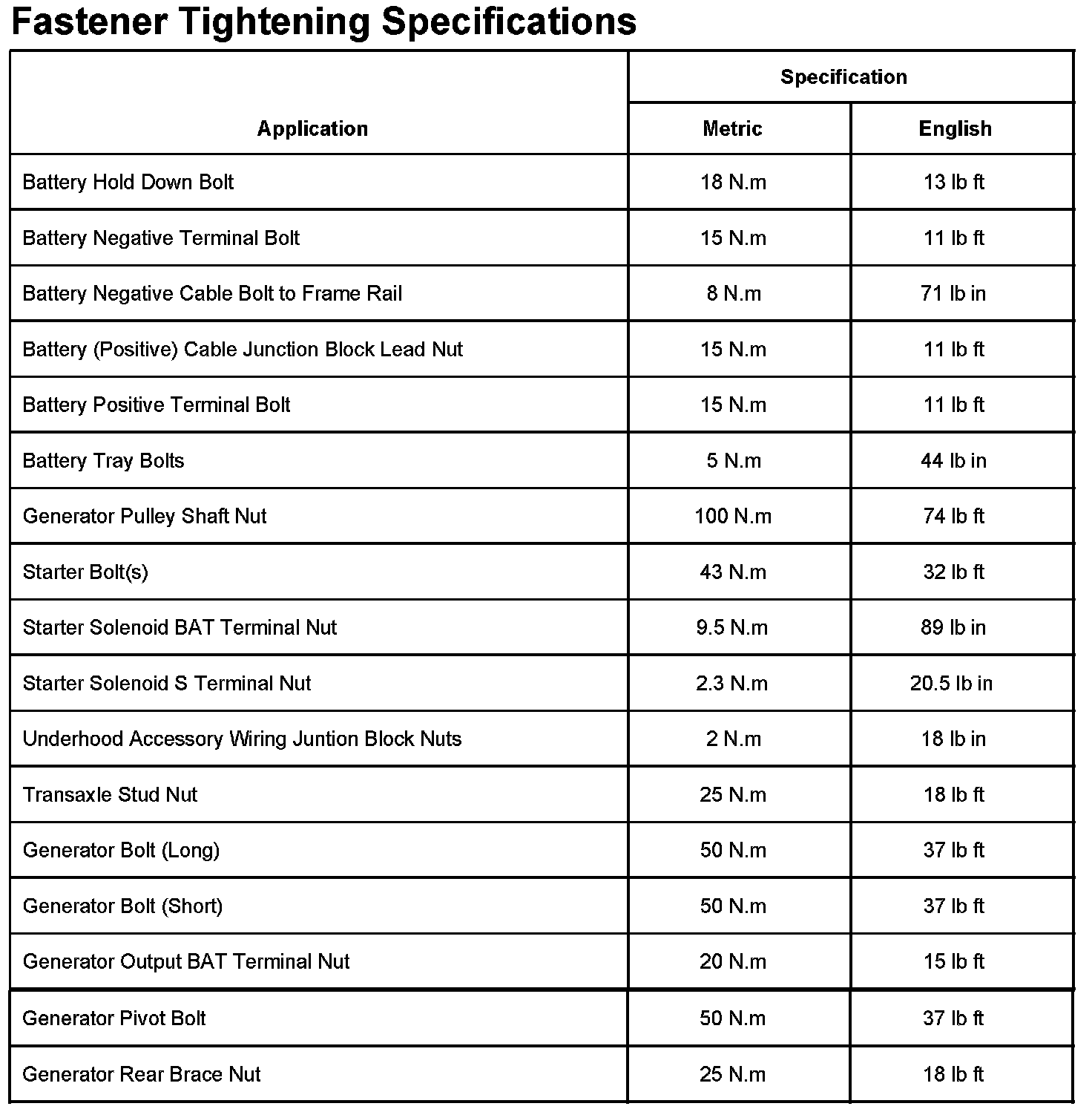 Fastener Tightening Specifications: