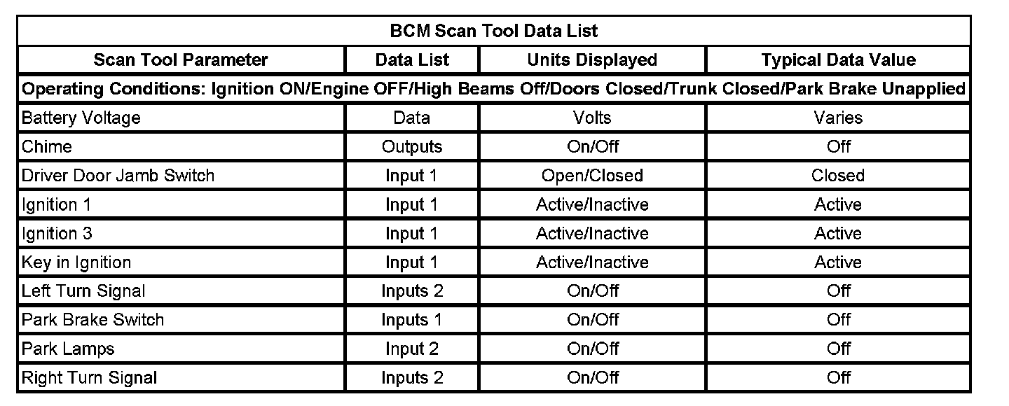 Scan Tool Data List - Body Control Module (BCM)