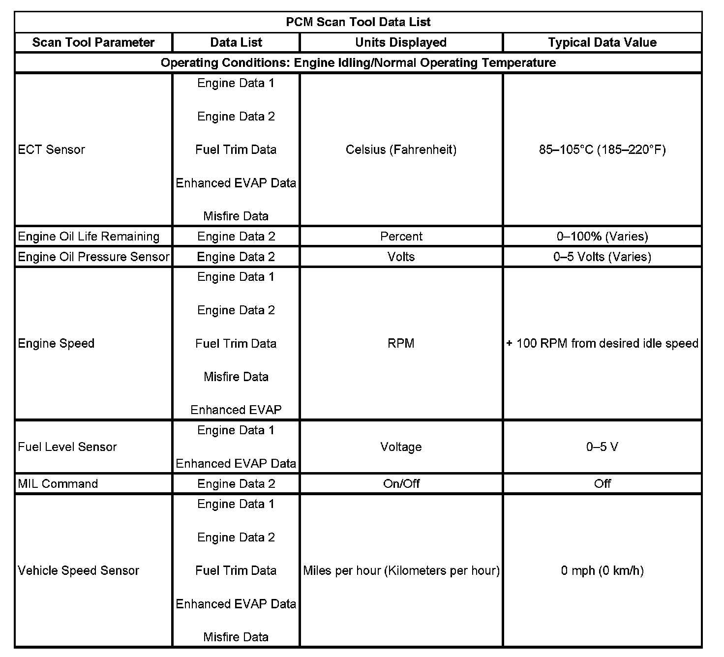Scan Tool Data List - Powertrain Control Module (PCM)