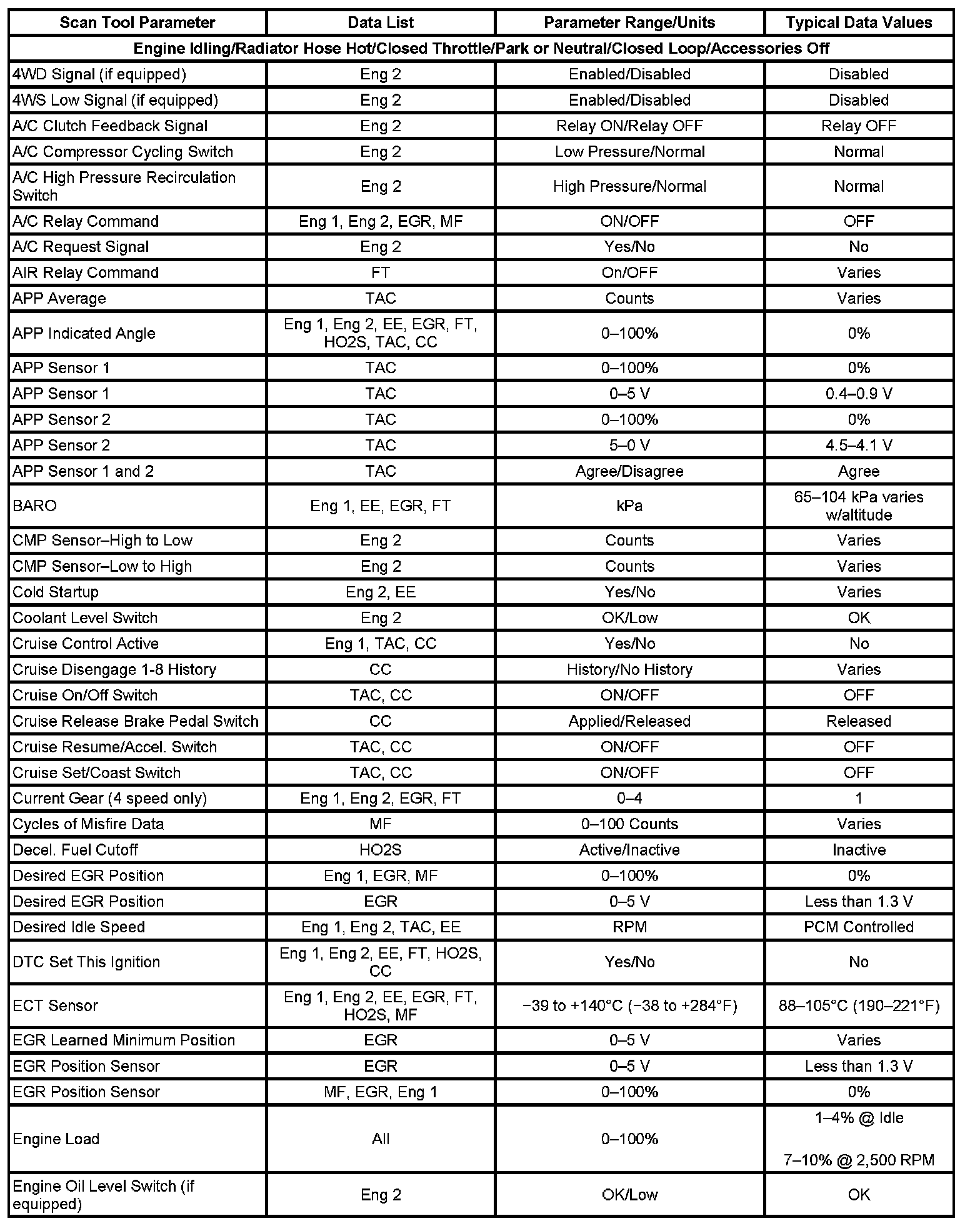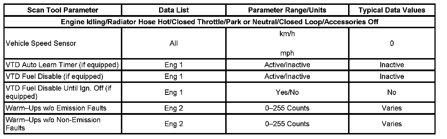 Only the parameters listed below are referenced in this service data for use in diagnosis. If all values are within the typical range described below, refer to Symptoms - Computers and Control Systems for diagnosis. Symptom Related Diagnostic Procedures