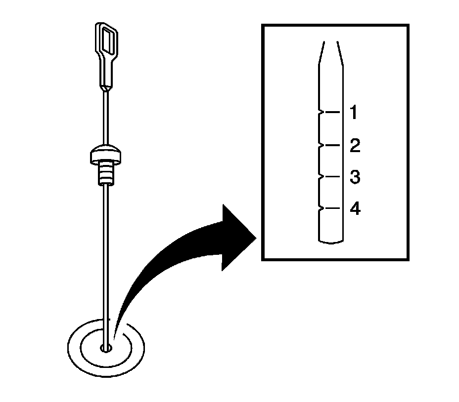 The correct fluid level must be between the HOT MIN (2) and the HOT MAX (1) notches on the dipstick.