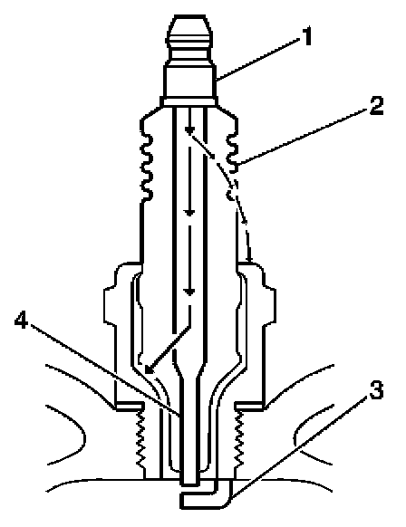 - Inspect for signs of tracking that occurred near the insulator tip instead of the center electrode (4).