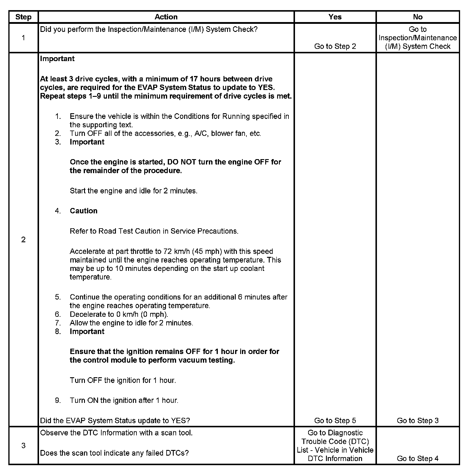 The purpose of this procedure is to satisfy the enable criteria necessary to execute inspection/maintenance (I/M) readiness diagnostics for the Evaporative Emission (EVAP) System. The procedure may be used to set the EVAP I/M System Status display on the scan tool to YES. The EVAP I/M System Status display indicates whether or not the control module has completed the readiness diagnostics. The readiness diagnostics complete when all DTCs comprising the diagnostics run and pass, or any DTC comprising the diagnostics illuminates the malfunction indicator lamp (MIL). If the diagnostics pass during one drive cycle, seventeen hours must elapse, regardless of whether the vehicle is driven or not. Then, the diagnostics will run again during the next drive cycle in which the conditions for running are met. Once the diagnostics have passed during the third drive cycle, the EVAP I/M System Status display will be updated to YES. A failed or aborted diagnostic will require the vehicle to cool down in order to meet the enable criteria for another drive cycle. Therefore, performing a visual inspection prior to running the EVAP test may prevent having to repeat the drive cycle.