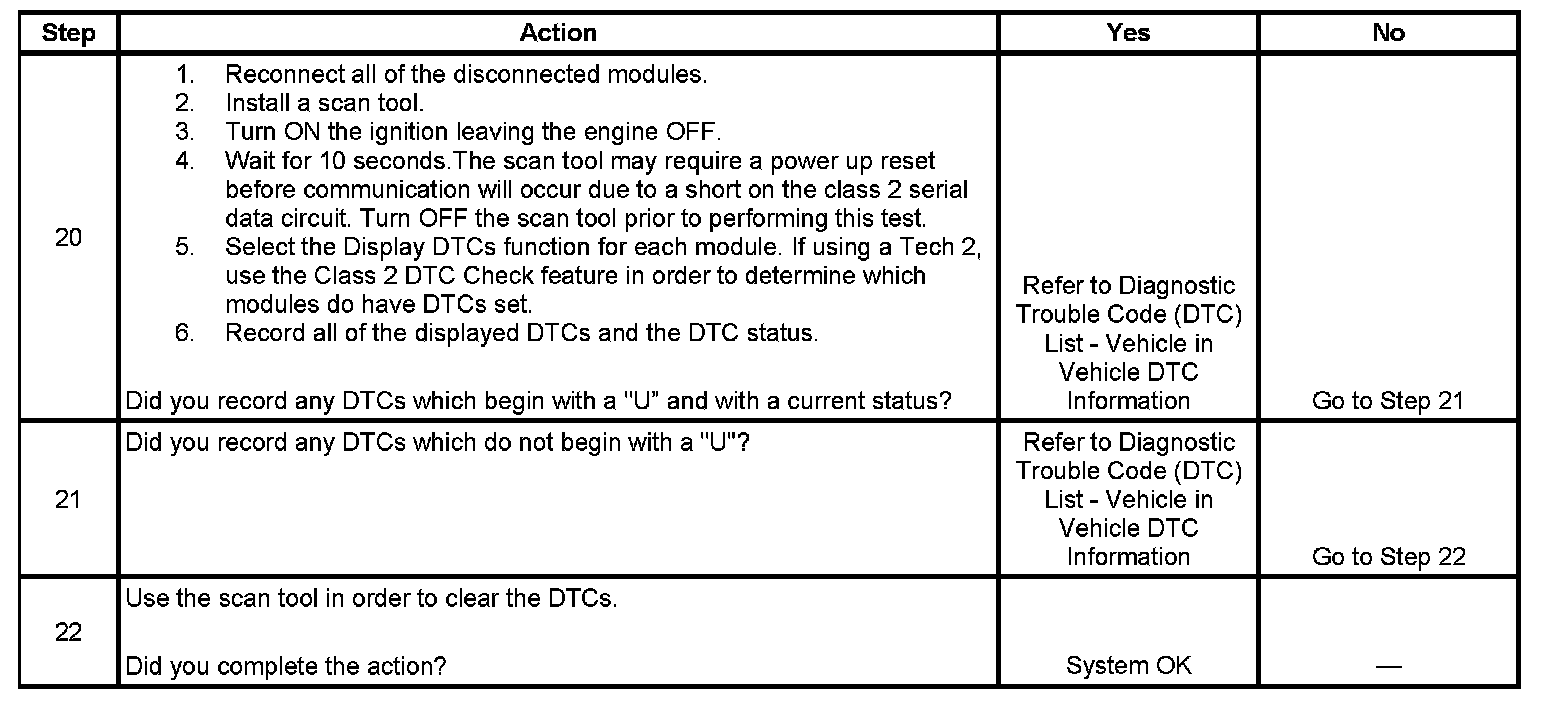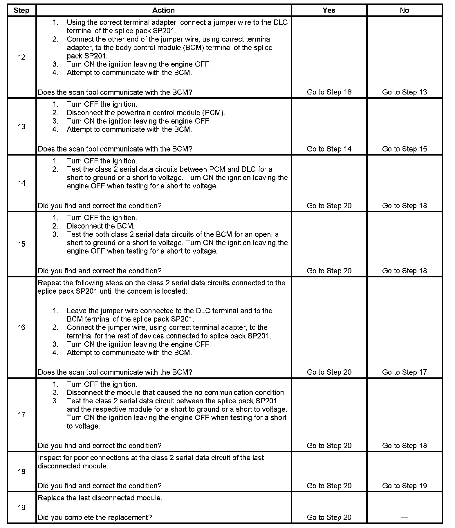 12. The class 2 serial data circuit is shorted to voltage or ground. The condition may be due to the wiring or due to a malfunction in one of the modules. When testing the wire for a short, make sure there is not a module connected to the wire being tested. This test isolates the BCM class 2 serial data circuits.