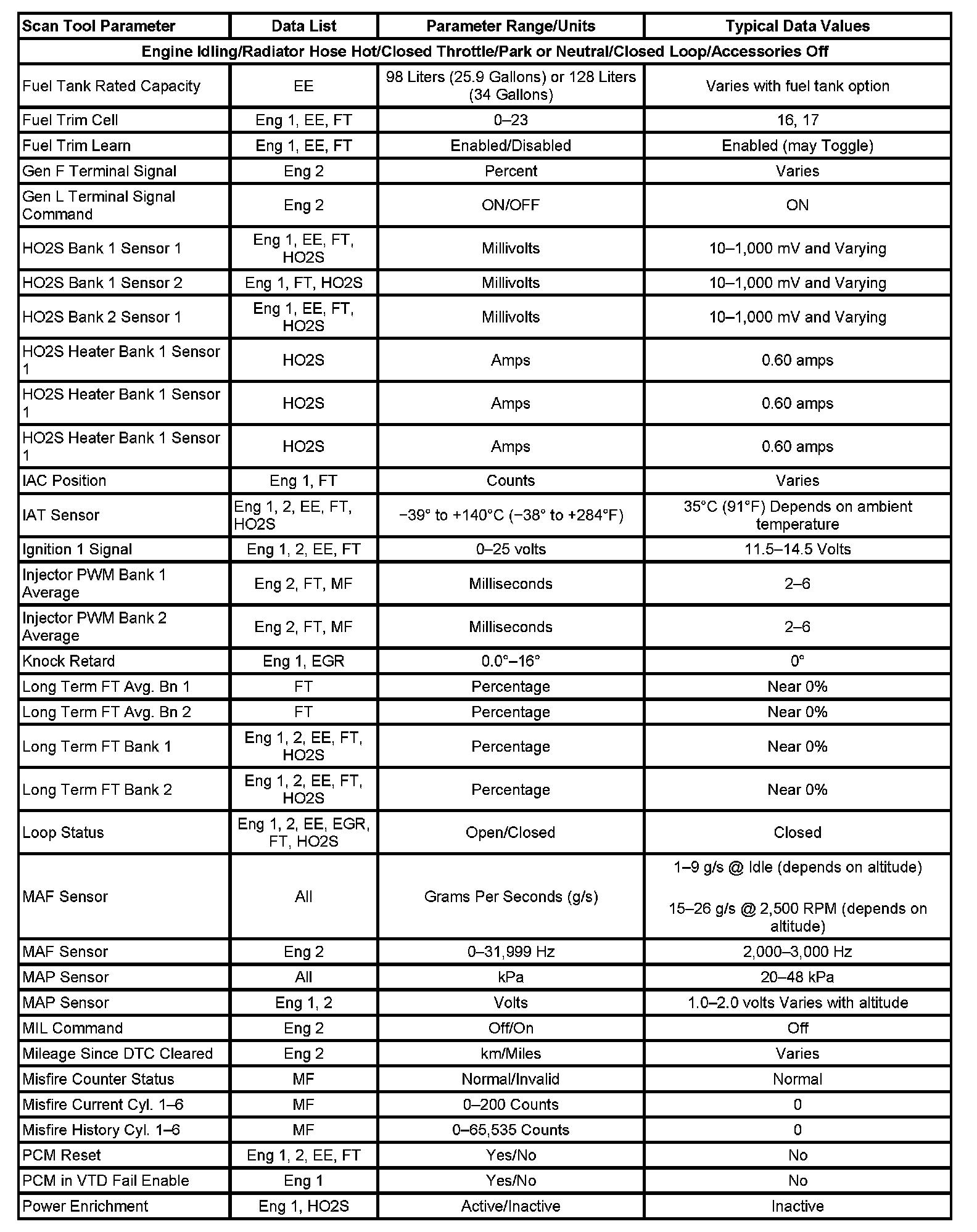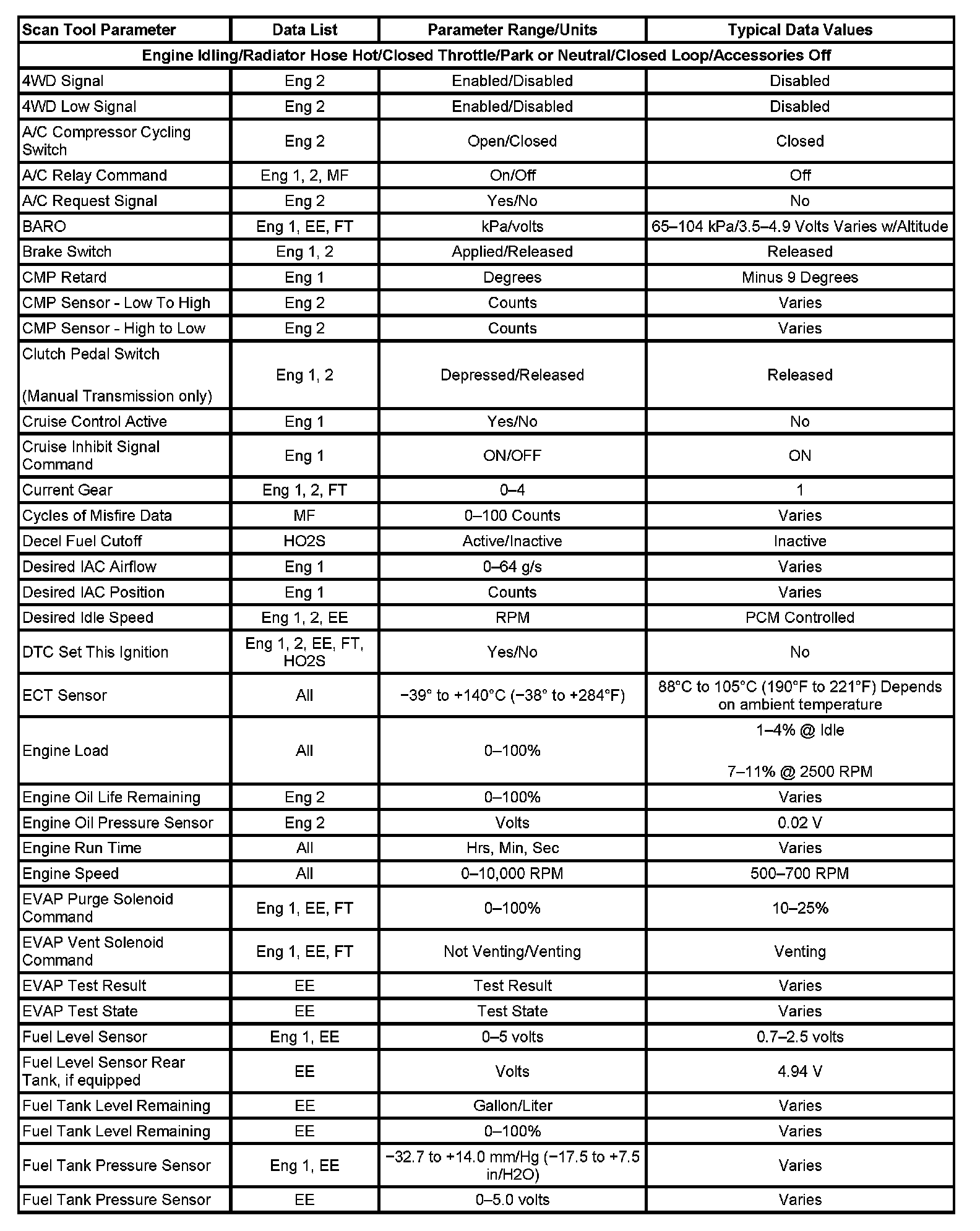 Scan tool values from a properly running engine may be used for comparison with the engine you are diagnosing. The Engine Scan Tool Data List represents values that would be seen on a normal running engine.
