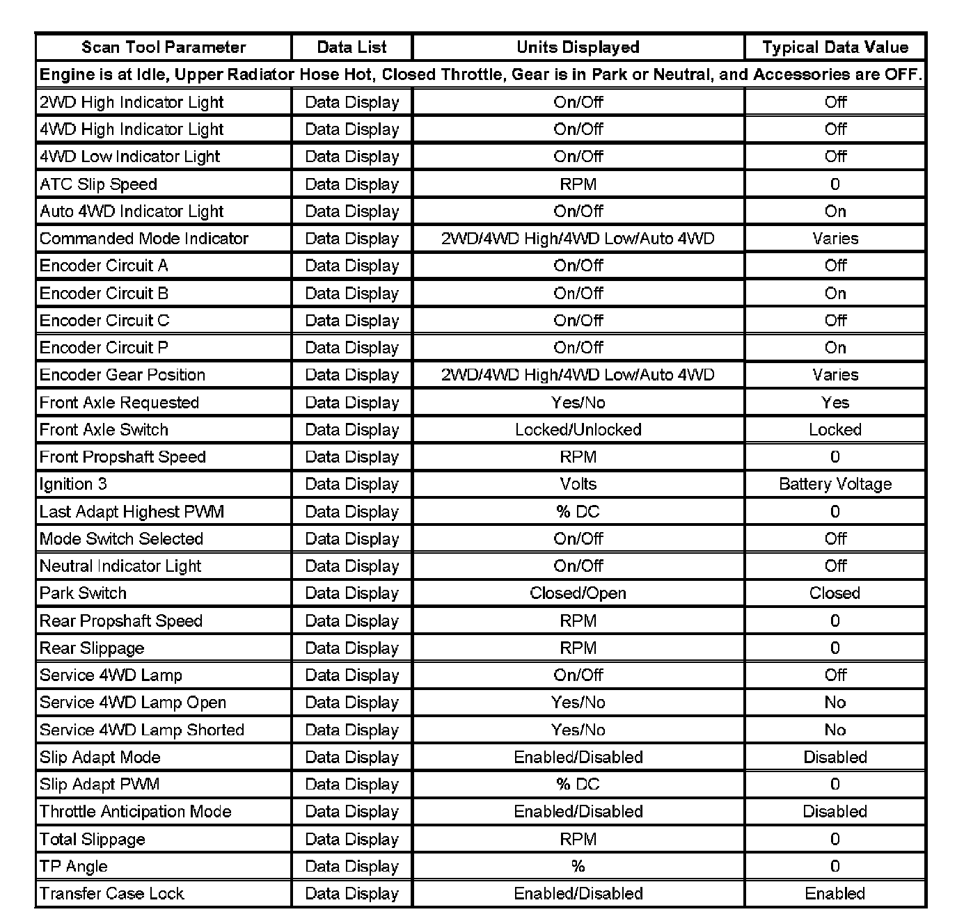 Scan tool values from a properly operating system may be used for comparison with the transfer case system you are diagnosing. The Transfer Case Scan Tool Data List represents values recorded under these conditions: