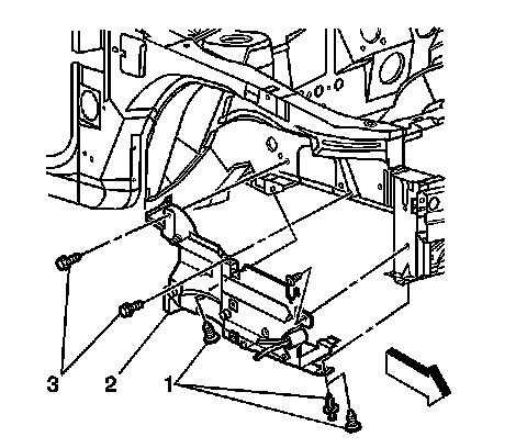 3. Use J 38778 to remove the push-in retainer (3) holding the left engine splash shield to the lower flange of the engine compartment side rail.