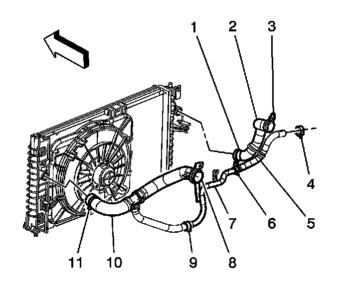17. Remove the surge tank inlet hose (3) and the clamp from the radiator.