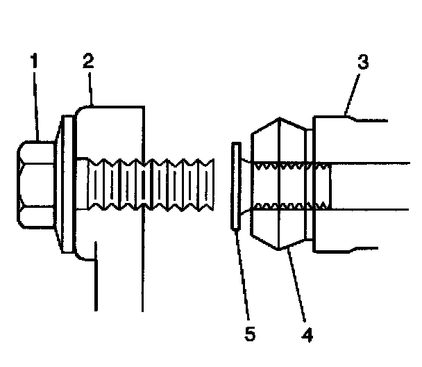 4. Install the caliper bolts (1) thru the caliper (2) and into the caliper pins (5).