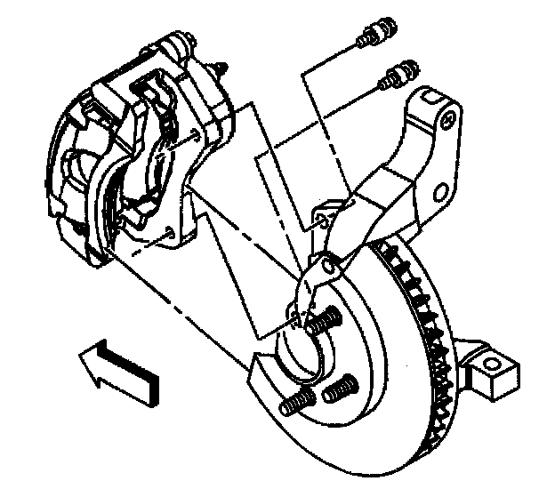 Notice: Support the brake caliper with heavy mechanic's wire, or equivalent, whenever it is separated from it's mount and the hydraulic flexible brake hose is still connected. Failure to support the caliper in this manner will cause the flexible brake hose to bear the weight of the caliper, which may cause damage to the brake hose and in turn may cause a brake fluid leak.